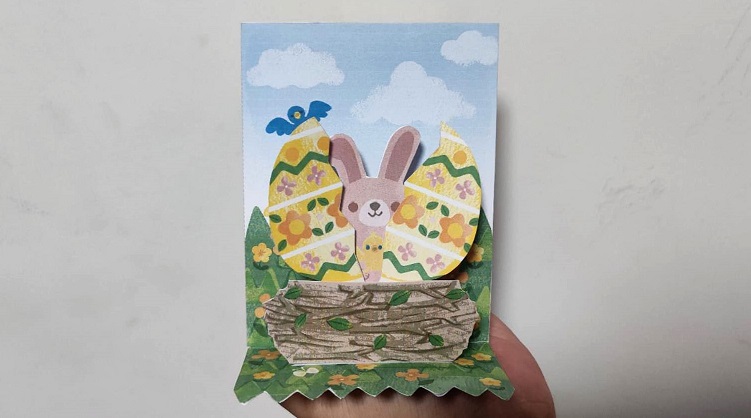 彩蛋中的小兔子 立体卡 Ayako Kishi 佳能官网 来自佳能官网,是一张复活节主题的立体卡片。主体为平行折结构,彩蛋是V形折结构。这种结构很经典,打开的同时会有动态的效果。而这张卡打开后,彩蛋会裂开露出小兔子,非常的可爱。 跳转下载 进入教程
